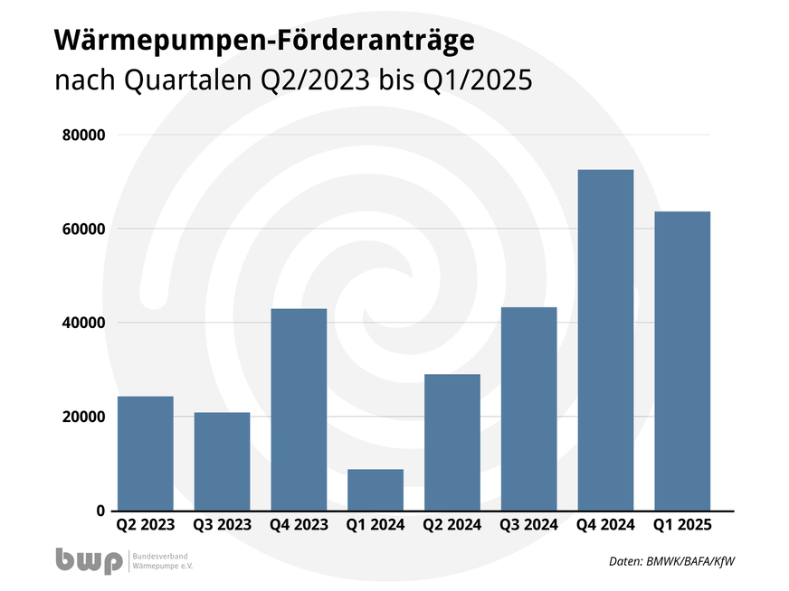 Für Januar bis Ende März 2025 hat der Bundesverband Wärmepumpe (BWP) einen herstellerseitigen Absatz von 62 000 Geräten gemeldet. Gegenüber dem Vorjahreszeitraum entspricht dies einem Plus von rund 35 %. Für das Vorquartal hatte der BWP einen Absatz von 53 000 Heizungs-Wärmepumpen gemeldet.