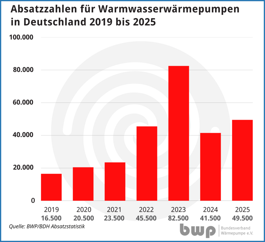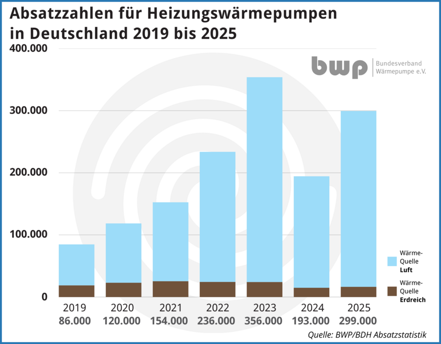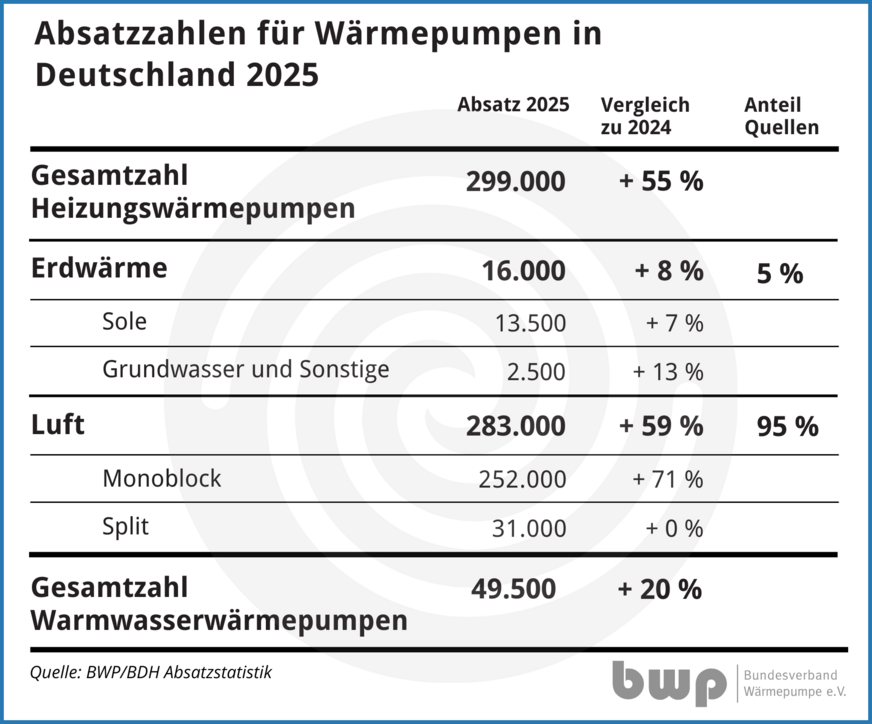 Erstmals sind knapp die Hälfte aller von den Herstellern für die Installation in Deutschland ausgelieferten („abgesetzten“) Wärmeerzeuger Wärmepumpen. Insgesamt waren es 299.000 Stück und zusätzlich 49.500 Trinkwasser-Wärmepumpen. Beim Blick auf die verschiedenen Typen blieben Luft/Wasser-Wärmepumpen mit 95 % Marktanteil weiter das dominierende System (Zuwachs beim Absatz um 59 %). Erdreich-Wärmepumpen hatten 2025 mit 16.000 Geräten einen Marktanteil von nur 5 % und einen Zuwachs von 8 %. Bei den Trinkwasser-Wärmpumpen stieg der Absatz gegenüber dem Vorjahr um 20 %.