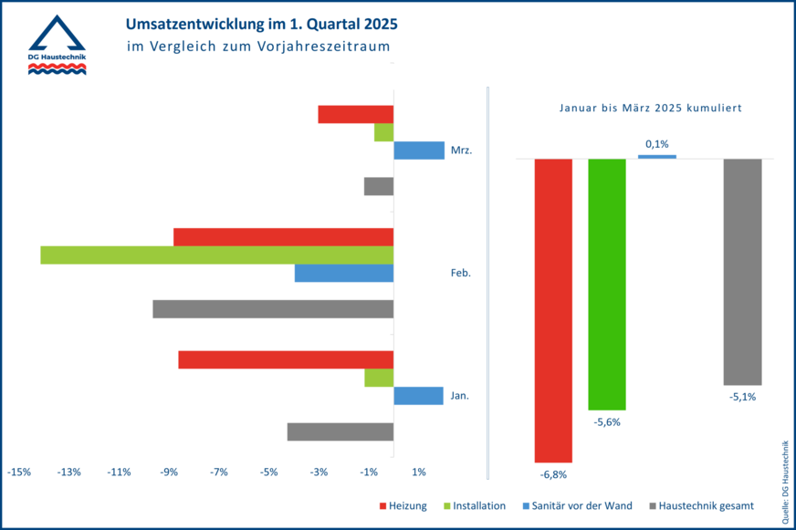 Auf Basis der Umsatzstatistik für das 1. Quartal 2025 sieht der Deutsche Großhandelsverband Haustechnik (DG Haustechnik) „noch keinen Grund zur Erleichterung“.