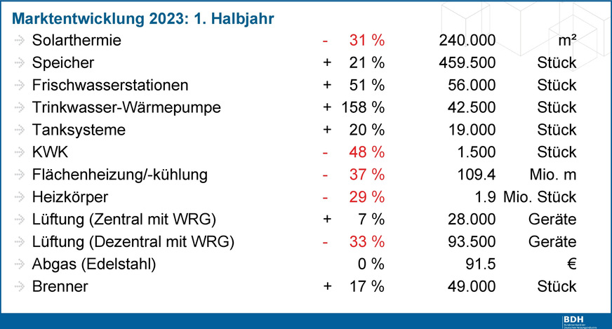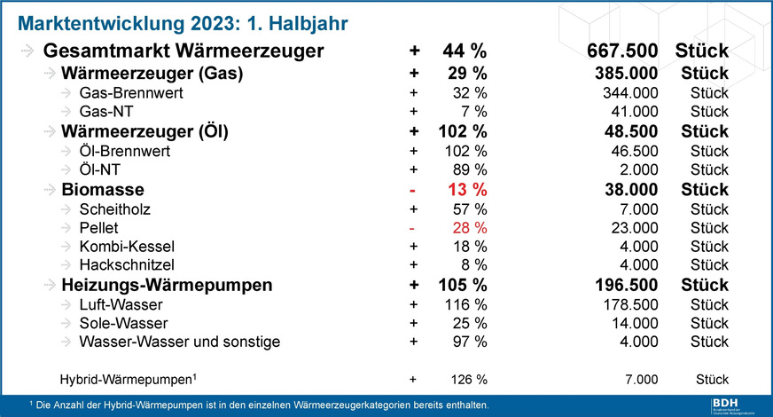 Der Markt für Heizungen in Deutschland ist im 1. Halbjahr 2023 gegenüber dem Vorjahreszeitraum laut einer vom Bundesverband der Deutschen Heizungsindustrie (BDH) veröffentlichten Marktstatistik deutlich gewachsen. Die im Verband organisierten Hersteller weisen für das erste Halbjahr 2023 insgesamt 667 500 abgesetzte Wärmeerzeuger aus. Das entspricht einem Plus von 44 % gegenüber dem Vorjahreszeitraum.