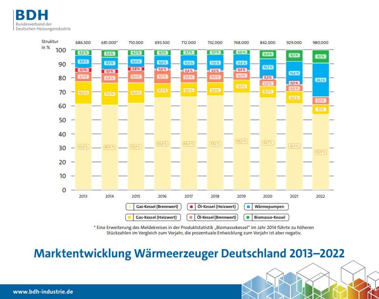 Den größten Zuwachs gegenüber dem Vorjahr verzeichneten mit einem Plus von 53 % und 236 000 abgesetzten Geräten die Wärmepumpe. Heizsysteme auf Basis von Biomasse, hier insbesondere Pelletheizungen, entwickelten sich mit einem Plus von 17 % und 89 000 abgesetzten Geräten ebenfalls überproportional stark. Dies führt der BDH insbesondere auf die Bundesförderung für effiziente Gebäude (BEG) zurück. Demgegenüber entwickelten sich gasbasierte Systeme mit einem Minus von 8 % und 598 000 verkauften Geräten im vergangenen Jahr rückläufig. Hier machte sich vor allem im 1. Halbjahr eine Unsicherheit bezüglich der Versorgungssicherheit und der Preisentwicklung bemerkbar.