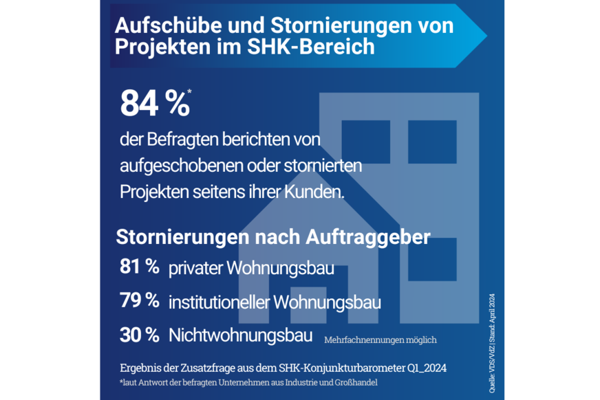 84,3 % der bei der Erhebung des SHK-Konjunkturbarometers zum 1. Quartal 2024 befragten Industrieunternehmen und Großhändler haben von verschobenen oder stornierten Projekten ihrer Kunden berichtet. Der Wert liegt leicht über dem Vorjahresniveau. Im Vergleich zum 1. Quartal des Jahres 2022 ist die Stornierungsquote um über 20 Prozentpunkte gestiegen (2022: 60 %).