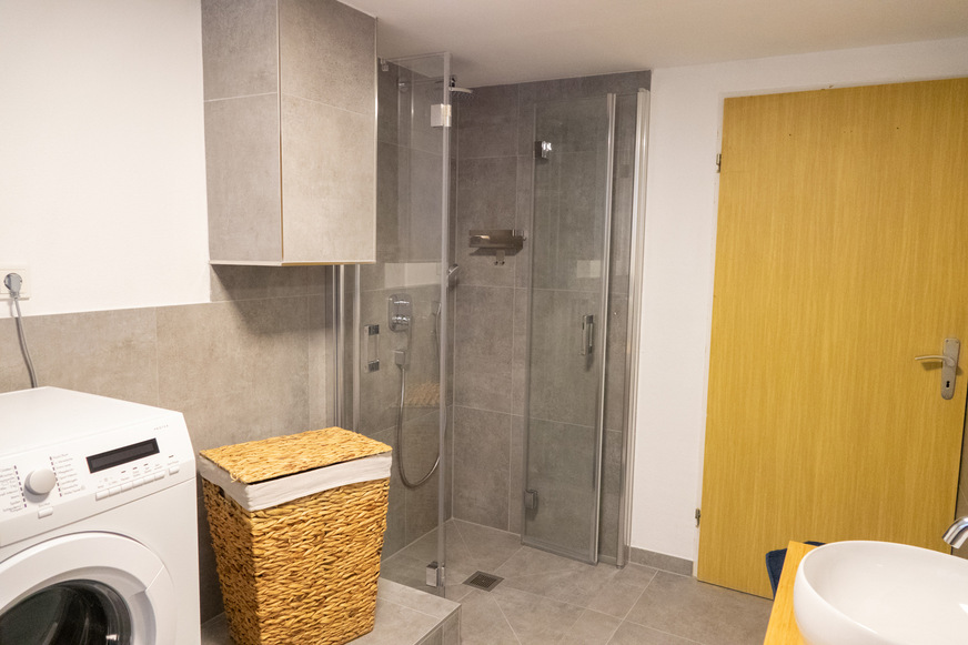 Auch das zweite Bad des Hauses wurde zu einem vollwertigen Bad für Gäste und als Ausweichbad renoviert. Es sollte funktional sein und Platz für eine Waschmaschine und einen Wäschekorb bieten.