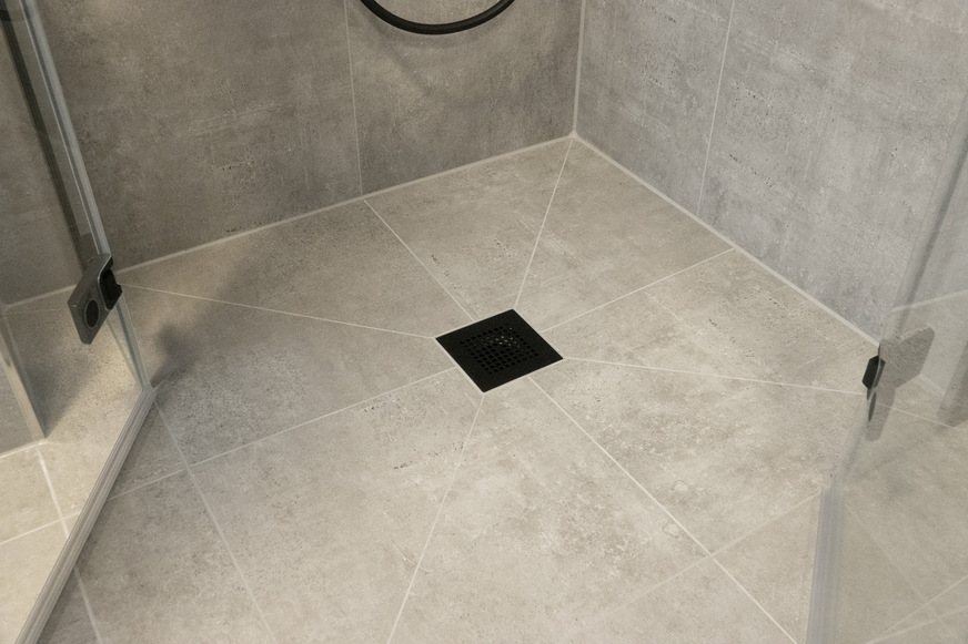 Um einen bodenebenen Duschbereich zu realisieren, musste die tiefe Duschwanne weichen. Der Boden wurde ausgenommen und mittels Estrich oder Ausgleichsmasse wurde der Duschbereich für die Einbauhöhe des Boards und den mittigen Ablauf vorbereitet. Anschließend wurde hier das Komplett-Duschboard E65 von Kermi installiert. Das Duschplatz-System hat einen werksseitig eingedichteten Ablauf und eine niedrige Einbauhöhe und eignete sich daher für den Renovierungsbereich.