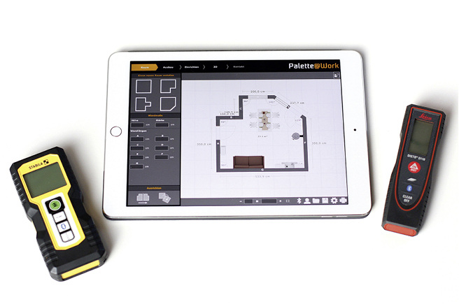 Das Stuttgarter Softwarehaus Palette CAD hat mit „Palette@Work“ eine App mit einem integrierten Laser-Aufmaßsystem zum 3D-Planen von Innenräumen im Portfolio. Die neue App funktioniert auf dem Tablet und enthält eine Schnittstelle zu Bluetooth-Lasermessgeräten von Leica und Stabila. Die Maße werden aus dem Laser direkt in die App eingelesen. Mit den Daten lassen sich erste Vorabplanungen in 3D erstellen. Diese können dann zur weiteren Bearbeitung fehlerfrei in Palette CAD übertragen werden. Die neue App basiert auf der Technologie des Onlineplaners Palette@Home Mithilfe dieser Technik kann man erste Entwürfe in 3D-Optik visualisieren und in Vorschau-Animationen erleben. Die App ist gegen einen geringen monatlichen Mietpreis erhältlich.