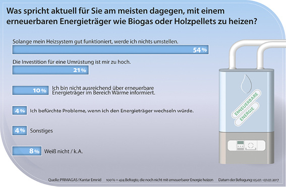 Obwohl die Mehrheit der Deutschen den Ausbau erneuerbarer Energien grundsätzlich befürwortet, ist deren Anteil bei der Wärmeversorgung gering. Aktuell sind 71 % der Heizungen veraltet und nur 17 % nutzen erneuerbare Energien. Eine Umfrage von Kantar Emnid erhellt die Gründe. Mehr als die Hälfte der befragten Hausbesitzer gaben an, dass sie nicht umstellen wollen, solange ihr Heizsystem intakt ist. Für 21 % sind hohe Investitionskosten der wichtigste Hinderungsgrund. Weitere 10 % fühlen sich nicht ausreichend über die Einsatzmöglichkeiten von regenerativen Wärmequellen informiert. Probleme bei der Umstellung fürchten dagegen nur 4 % der Befragten.
