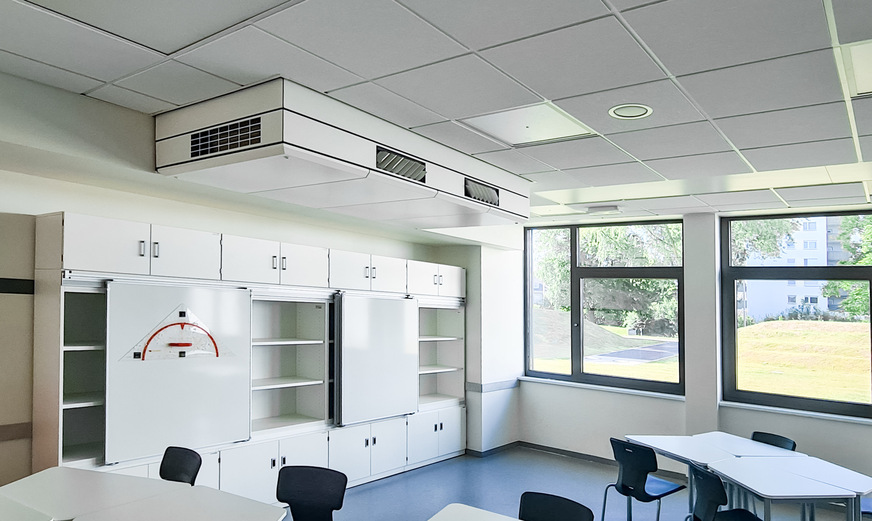 Da der Rohbau bereits weitgehend fertiggestellt war, konnten bestimmte Anforderungen hinsichtlich Statik, Brandschutz und Platzangebot im Vorfeld nicht mehr berücksichtigt werden. Eine Herausforderung bestand z.B. darin, dass die Zwischendecken keinen Platz für die Installation eines Luftkanalnetzes boten. Nach fundierter Beratung entschieden sich Bauherren und Planer daher für den Einsatz dezentraler Lüftungsgeräte aus der Duplex-Vent-Serie in den Klassenräumen: Die Geräte lassen sich raumweise, individuell und zielgerichtet steuern und beanspruchen keinen zusätzlichen Platz für lange Kanalführungen. Durch den Wegfall aufwändiger Luftkanäle ist der Installationsaufwand gering.