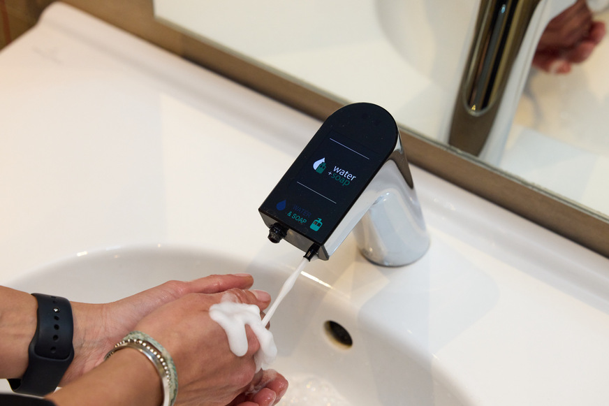 Für Bereiche, in denen Seife nicht unbedingt erforderlich ist, wie bspw. in Wickelräumen, ist die Armatur Intelliflow verbaut. Diese Variante ermöglicht die gleichen Wasserersparnisse im passenden Design, jedoch ohne automatische Seifenspender. Sie kann mit dem neuen Ceratherm T Eckventil kombiniert werden, das auch bei einer niedrigen Durchflussrate von 1,9 l/min konstant warmes Wasser bereitstellt. Anders als herkömmliche Modelle liefert das Eckventil auch bei reduziertem Wasserfluss eine zuverlässige Leistung und sorgt für ein angenehmes Händewaschen.