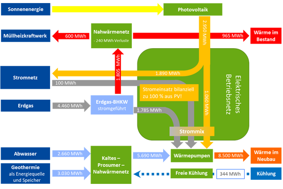 Der Löwenanteil des Strombedarfs für das neue Quartier kommt von den Photovoltaik-Anlagen. Rund 14 000 m2 Modulfläche installieren die Stadtwerke Bamberg auf den Dächern der Neubauten und auf dem Dach der Energiezentrale. Sie liefern im Endausbau jährlich etwa 2950 MWh Strom, von denen ein großer Teil in den Betrieb der Wärmepumpen fließt.