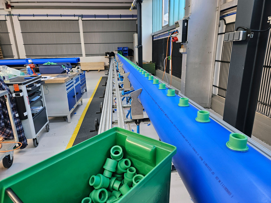 Ein besonderes Highlight des Systems ist der Hauptverteiler, der von aquatherm über den niederländischen Partner Eriks vorgefertigt geliefert wurde. Der Verteiler – mit Durchmessern bis zu 200 mm und einem Gesamtgewicht von über 2 t – wurde am aquatherm-Hauptsitz in Attendorn komplett vormontiert und für die direkte Installation vorbereitet. Diese enge Zusammenarbeit zwischen aquatherm, Eriks und RIHO war entscheidend, um die Montagezeit vor Ort zu minimieren. Schließlich musste der Kühlboden im engen Zeitfenster zwischen den Saisons fertiggestellt werden. Auch die Rohrbögen – die Verbindungen zwischen Vor- und Rücklaufleitungen – wurden teilweise von RIHO in der eigenen Werkstatt im niederländischen Vorden vorgefertigt.