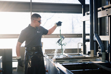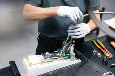 Vom rohen Körper zum Edelmetall. In der Galvanik erfolgt die Oberflächenveredelung von Hand. Dabei werden hochwertige, metallische Oberflächen aufgebracht.