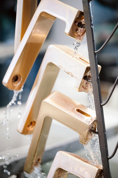 Nach der Demontage der zurückgenommenen Armatur erfolgt die elektrolytische Entschichtung. Die ReCrafted-Komponenten werden auf Galvanikgestelle aufgesteckt und die wertvollen Oberflächenrohstoffe – wie beispielsweise Gold – im elektrolytischen Verfahren zurückgewonnen.