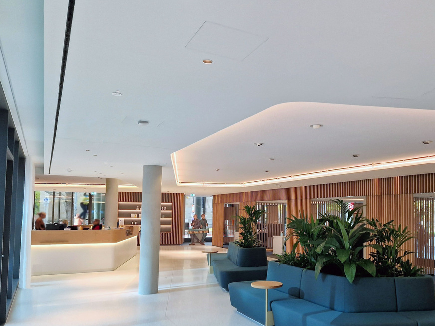 In den Büroetagen der oberen Stockwerke samt Open-Space-Arbeitsbereichen fiel die Wahl auf die Kiefer Schlitzdurchlässe Indulsnap als Einzel- und Kombinationsluftdurchlass für Zuluft und Abluft. Das bewährte Indul-Ausblasprofil kombiniert auch hier große Leistungsfähigkeit mit hohem Komfort. Indulsnap ist überdies ein Wand-Luftdurchlass mit integriertem Telefonieschalldämpfer, der komplett in der Trockenbauwand verschwindet – für konzentriertes Arbeiten und eine angenehme Gesprächsatmosphäre. Um Ventilatorgeräusche zu reduzieren, sind zusätzlich in die verschiedenen Kanal- und Rohrleitungen sowie im Lüftungsgerät jeweils Absorptionsschalldämpfer eingebaut.
