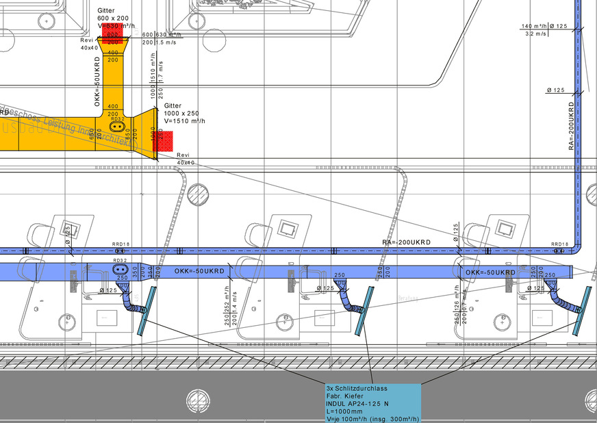Die Zuluft wird über die Kiefer Schlitzauslässe Indul in die Büro- und Beratungsräume des Kundencenters eingebracht. Den Schlitzauslässen sind Volumenstrombegrenzer vorgelagert, die die Luftmengen der einzelnen Auslässe untereinander auf einen definierten Sollwert abgleichen. In diesem Fall beträgt der Volumenstrom jeweils 125 m3/h. Charakteristisch für den hochwertigen Schlitzauslass ist seine speziell entwickelte Ausblasgeometrie, für besonders feine Einzelstrahlen. Diese wiederum ermöglichen eine schnelle Induktion, also Beimischung der Raumluft, sodass Temperaturdifferenzen schnell abgebaut werden und kein unangenehmes Zugluftgefühl auftritt.