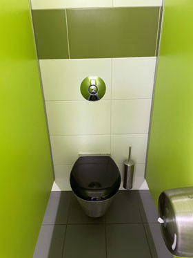 Bei den Waschtischen, WCs und Urinalen fiel die Wahl auf Produkte aus Edelstahl Werkstoff 1.4301. Die Edelstahlausstattung ist perfekt für den hektischen Schulalltag geeignet. Zum einen ist sie aufgrund bakteriostatischer Eigenschaften besonders hygienisch und leicht zu reinigen. Zum anderen ist der Werkstoff langlebig und bruchfest.