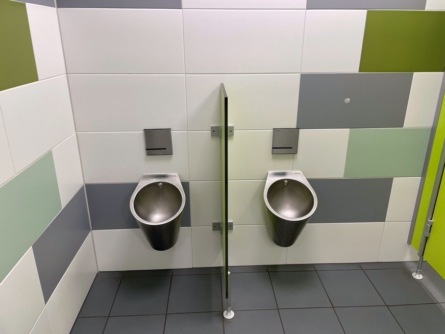 Bei den Urinalen, die auf verschiedenen Höhen montiert worden sind, um den Altersunterschieden der Schüler gerecht zu werden, wurden ebenfalls elektronische Lösungen verbaut. Mit der Urinalspülarmatur Tempomatic 4 kann dank des Stoßzeit-Programms in Schulpausen der Wasserverbrauch optimiert werden. Das intelligente Spülsystem erkennt Stoßzeiten (z.B. Pausen) und passt das Spülverhalten an. Nach jeder Nutzung wird das Becken mit einer kleinen Menge Wasser gesäubert, um anschließend nach Ende der Schulpause mit einer gründlicheren Spülung auch das Wasser im Siphon zu erneuern.