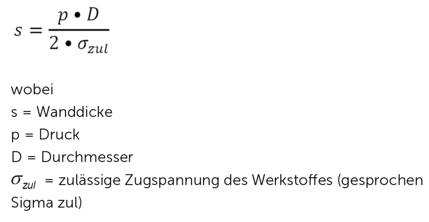 Für die folgenden Ausführungen wird das Rohr in den Mittelpunkt der Betrachtungen gestellt. Die Zusammenhänge lassen sich aber immer auch auf einen Pufferspeicher oder Ähnliches übertragen. Man kann, wenn man möchte, auf Anhieb die logischen Zusammenhänge aus der Formel he­rauslesen. Die Unterscheidung zwischen Zähler und Nenner lässt nämlich tief blicken. Je größer Druck oder Durchmesser sind, desto größer muss die Wandstärke des Rohres sein. Klar, denn diese Kürzel stehen als Zähler auf dem Bruchstrich (2/1 < 3/1).