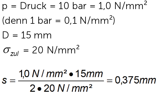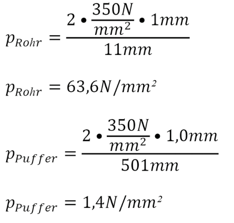 Das Stahlrohr könnte einen Druck bis 636 bar vertragen, der Puffer würde, bei gleicher Wandstärke, bereits bei 14 bar schwächeln. Für die Praxis wird die beschriebene Formel zur Bestimmung der Wandstärke noch um Komponenten erweitert. Bspw. können Wandstärken-Toleranzen bei der Fertigung von Rohren eine Schwachstelle darstellen.