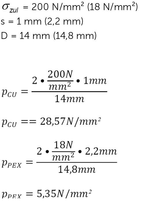 Um die in der Praxis verwendeten Rohre mal zu prüfen, kann die Formel natürlich auch auf gängige Rohre angewandt werden. Nehmen wir mal ein CU- und ein PEX-Rohr. Das CU-Rohr in der Dimension 15 x 1 und das PEX-Rohr in 17 x 2,2. Welchen Drücken halten diese marktüblichen Rohre stand?