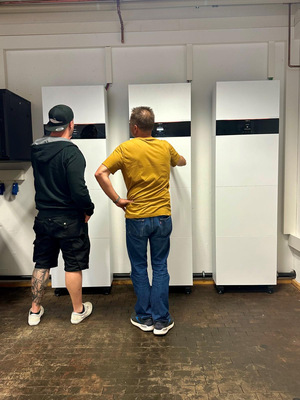 Der Spatenstich des mit Fußbodenheizung und Kühldecke ausgestatteten Wärmepumpenzentrums erfolgte am 8. Juni 2022. Die Innung verfügt zudem über 72 PV-Kollektoren mit drei Batteriespeichern, die eine Speicherkapazität von insgesamt 45 kWh besitzen. „Hiermit können wir das Zentrum in den Sommermonaten einen Tag lang vollständig mit Strom zu versorgen“, erläutert Bock. Im Keller des Innungsgebäudes befindet sich zudem eine Feldversuchsanlage mit einer Wärmepumpenkaskade. Sofort wird klar: Hier wirken findige, kompetente Fachleute, die ihr Handwerk mit Leidenschaft beherrschen!