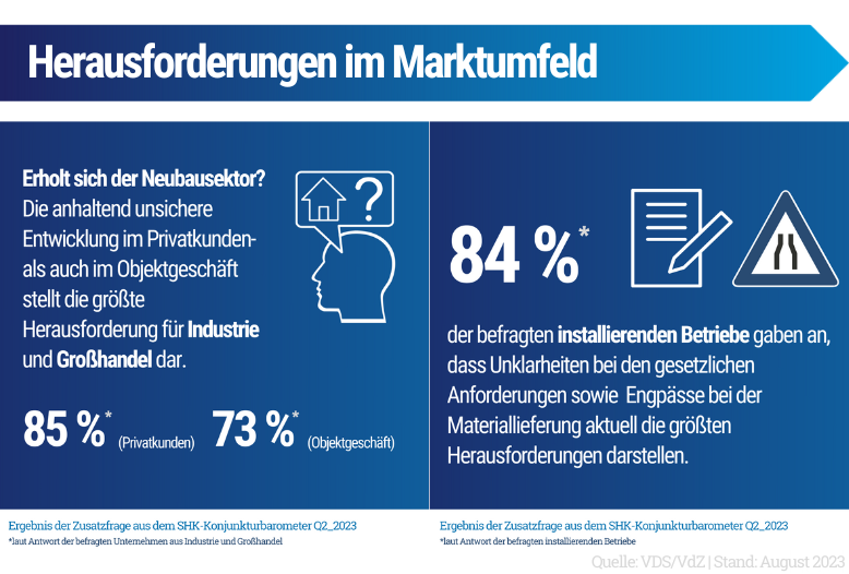 Die SHK-Branche ist wie die deutsche Bauwirtschaft insgesamt von starken Unsicherheiten geprägt. Steigende Zinsen wirken sich negativ auf das Neubausegment aus. Dies hat vor allem im Wohnungsneubau Folgen: Die Nachfrage geht zurück. Die allgemeine konjunkturelle Unsicherheit und die hohen Energiekosten führen zudem zu einer Verschiebung von Projekten im Renovierungsbereich. Somit entwickeln sich nicht nur Neubau- und Sanierungsmarkt gegensätzlich, auch die Produkte und Sortimente profitieren unterschiedlich stark von den aktuellen Gegebenheiten bzw. sind ungleich stark betroffen.