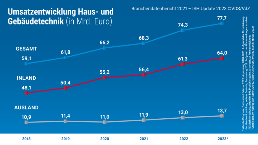 Für 2023 werden steigende Umsätze in Höhe von 77,7 Mrd. Euro (+4,5 %) erwartet. Allerdings wird das Umsatzwachstum in 2023 voraussichtlich schwächer ausfallen als im Jahr 2022. Die Gründe dafür liegen insbesondere in der konjunkturellen Abkühlung im Neubau von Ein- und Zweifamilienhäusern. Auch der Aufschub von nicht zwingend notwendigen Sanierungen im Bad führt zu einer schwächeren Nachfrage. Gestiegene Preise für Baumaterialien und Zinsanstiege drosseln die Neubauvorhaben merklich. Gleiches gilt für Investorenprojekte im Inland.