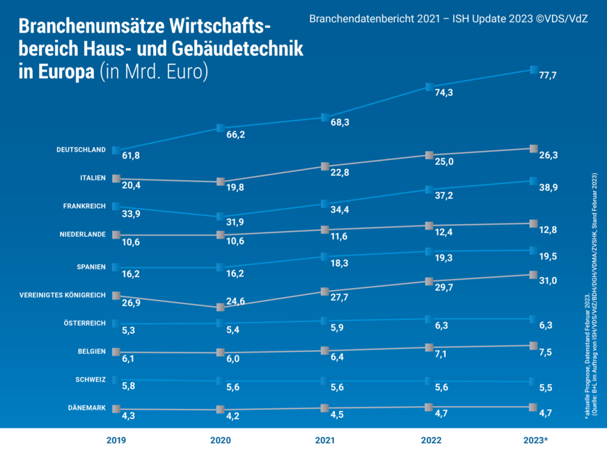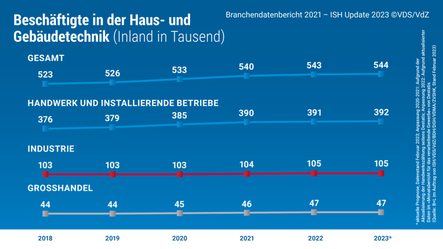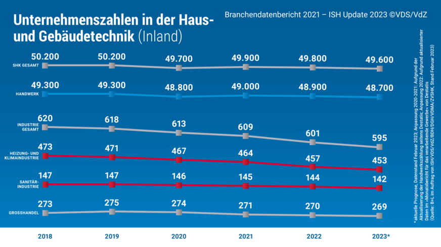 Die Branchendaten Haus- und Gebäudetechnik bilden die aktuellen Entwicklungen der Bereiche Sanitär, Heizung, Lüftung und Klima ab. Die Erhebung erfolgt im Auftrag der VdZ – Wirtschaftsvereinigung Gebäude und Energie e.V., VDS – Vereinigung Deutsche Sanitärwirtschaft e.V., BDH – Bundesverband der Deutschen Heizungsindustrie e.V., DG Haustechnik – Deutscher Großhandelsverband Haustechnik e.V., VDMA – Verband Deutscher Maschinen- und Anlagenbau, ZVSHK – Zentralverband Sanitär Heizung Klima sowie unter Mitarbeit der ISH. Die Branchendaten werden seit dem Jahr 2020 von der B+L Marktdaten GmbH erhoben.