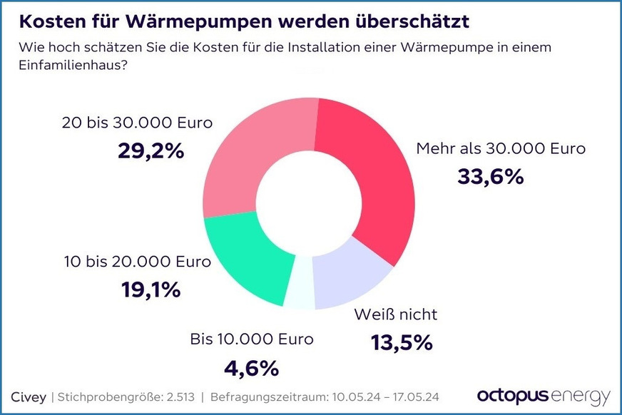 Ein Drittel der Hausbesitzer in Deutschland (33,6 %) glaubt, dass man für eine neue Wärmepumpe in einem Einfamilienhaus mehr als 30 000 Euro bezahlt. Dass die Eigeninvestition für die Anschaffung und Installation nach Abzug der Heizungsförderung unter 10 000 Euro beginnt, scheint kaum bekannt zu sein. Nur ein Viertel der Befragten (23,7 %) schätzt den Preis auf weniger als 20 000 Euro. Das ergab eine repräsentative Umfrage unter Hausbesitzern von Octopus Energy und dem Marktforschungsinstitut Civey.