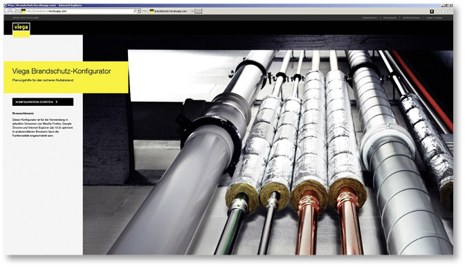 Mit dem von Viega entwickelten Brandschutz-Konfigurator lässt sich eine Schachtbelegung planen, die den aktuellen Brandschutzvorschriften entspricht. Die Planung von Rohrleitungsinstallationen auf Nullabstand durch die Abschottung von Brandschutzabschnitten beispielsweise soll dadurch vereinfacht werden. Die Konfiguration startet mit Angaben zur Art der Durchführung sowie zur Deckenstärke. Anschließend kann direkt mit der virtuellen Schachtbelegung per Mausklick begonnen werden: Zug um Zug wird jeweils ein Rohr- bzw. Leitungssystem mit seiner Funktion, der gewünschten Dimension und möglichen Abschottungen hinzugefügt.