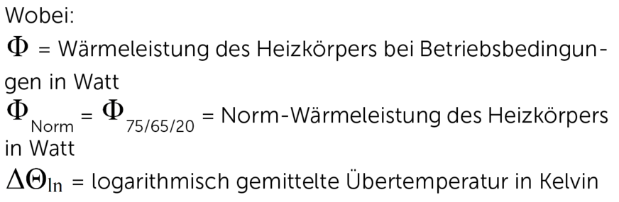 Mit dieser Formel bekomme ich heraus, welche Leistung ein bekannter Heizkörper unter den genannten Bedingungen abgeben würde.