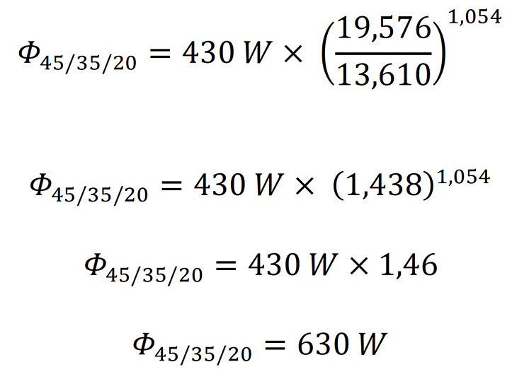 Aus einer Liste für die Betriebsbedingungen 45/35/20 müsste ich also einen Heizkörper picken, der 630 W Leistung bringt.