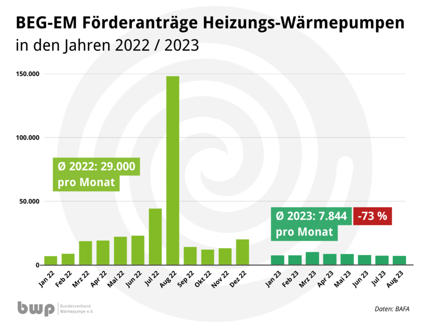 Der BWP verweist darauf, dass die Wärmepumpenförderung der Bundesanstalt für Wirtschaft und Ausfuhrkontrolle (BAFA) ein besserer Indikator für die aktuelle Nachfrage sei, weil Förderanträge unmittelbar vor Beauftragung einer neuen Wärmepumpe gestellt würden. Die Anzahl der monatlichen Förderanträge ist hier im Vergleich zum Vorjahr um 73 % zurückgegangen.