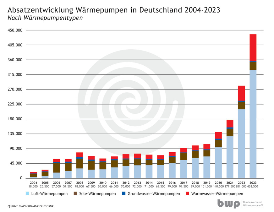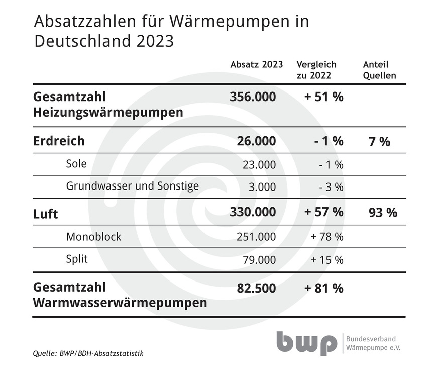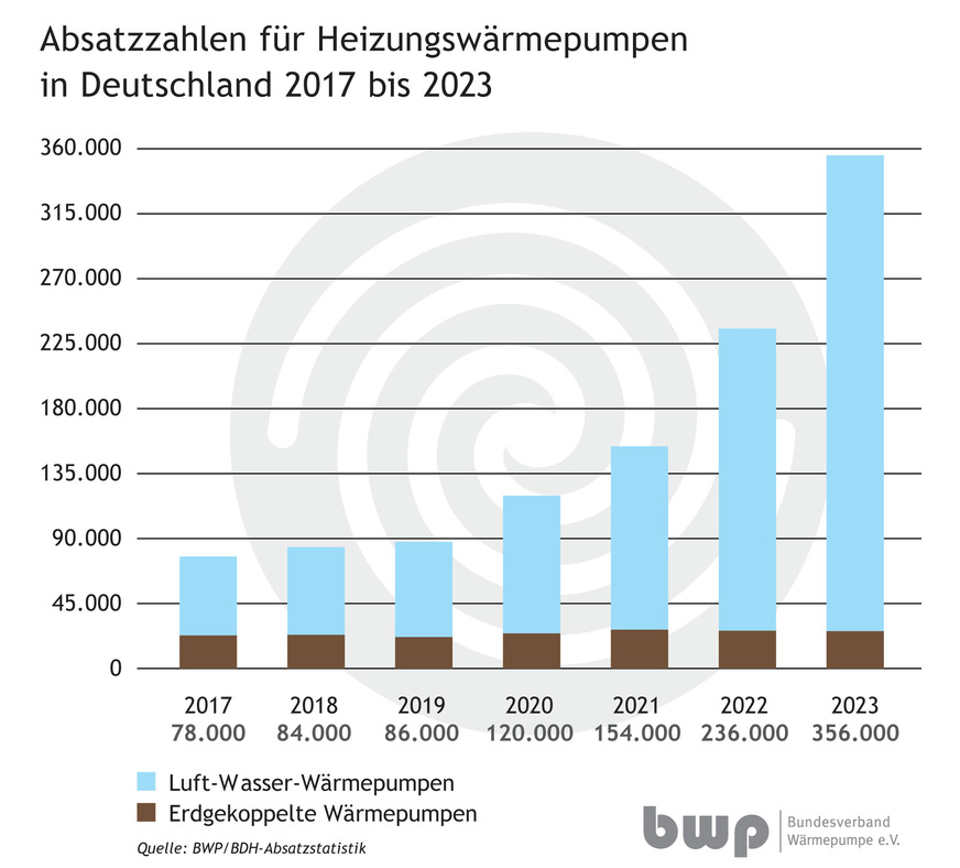 Mit 356 000 Geräten wurden laut BDH/BWP-Absatzstatistik so viele Heizungswärmepumpen wie noch nie in der bundesdeutschen Geschichte durch die Hersteller verkauft. Damit wächst der Absatz im zweiten Jahr in Folge um mehr als 50 %.