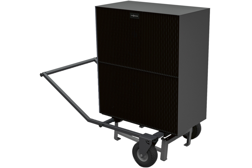 Die neue Transport- und Aufstellhilfe von Viessmann Climate Solutions unterstützt Fachpartner bei der Aufnahme der Außeneinheit von der Transportpalette bis hin zum Absetzen auf einer Bodenkonsole am endgültigen Standort. Ein bis maximal zwei Personen reichen dabei laut Anbieter üblicherweise völlig aus. Die robuste Transport- und Aufstellhilfe besteht aus einer verschweißten Stahlkonstruktion und bietet mittels Luftreifen auch über Rampen und Stufen eine gute Geländegängigkeit.