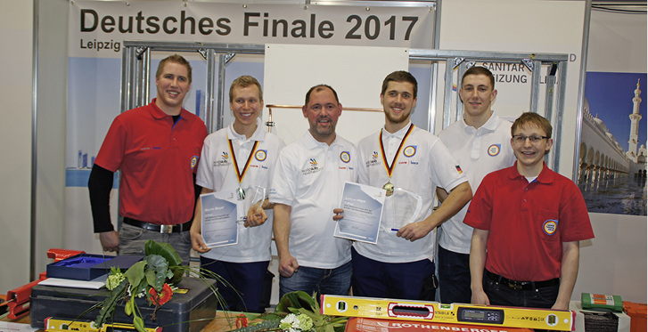 Es war ein äußerst knappes Ergebnis. Die beiden Anlagenmechaniker für Sanitär, Heizung und Klima, Lukas Heyn (Sachsen, 3. v. r.) und Martin Meyer (Bayern, 2. v. l.), gaben beim Finale auf der Mitteldeutschen Handwerksmesse in Leipzig ihr Bestes. Am Ende lag Lukas Heyn mit ein paar Punkten vorn. Beide Finalisten hatten sich zuvor bei einem bundesweit ausgeschriebenen Qualifizierungswettkampf im WorldSkills Germany-Bundesleistungszentrum, dem SHK-Schweinfurt, gegen vier weitere junge Fachkräfte durchgesetzt.