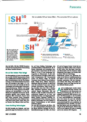Die Industrie zeigt in Frankfurt keine Visionen, sondern sofort nutzbare Produkte und Systeme. Gerade in diesem Jubiläums-Jahr der ISH wird das durch den Fokus auf das über alle Bereiche reichende Thema der Ressourcenschonung deutlich: Mit ihrem Verbund von Wasser und Energie ist die ISH – gemessen an ihrem Angebotsspektrum die weltgrößte Messe für Gebäudetechnik und vereint die Erlebniswelt Bad und die Gebäude-, Energie- und Klimatechnik. Mittlerweile präsentieren sich rund 2400 Firmen in diesem Verbund, darunter alle Markt- und Technologieführer. Der Erfolg basiert darüber hinaus auf der Zusammenarbeit mit vielen Partnern, allen voran die Trägerschaftsverbände, der Zentralverband Sanitär Heizung Klima, die Vereinigung Deutsche Sanitärwirtschaft und die Vereinigung der deutschen Zentralheizungswirtschaft. Dabei kommt mittlerweile jeder vierte Messegast aus dem Ausland; bei den Ausstellern sind es über die Hälfte. Mit über 200000 Besuchern ist die ISH die besucherstärkste Veranstaltung der Messe Frankfurt.