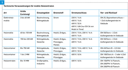 Bei einem Einsatz muss neben dem Brennstoff auch die Infrastruktur vor Ort beachtet werden. Neben Anschlüssen für Strom sind auch welche für Kaltwasser nötig. Diese differieren je nach Einsatzgröße der mobilen Heizungen ( Tabelle 1 ).