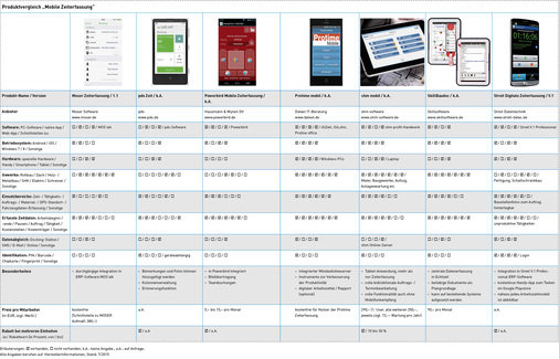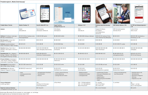 Rund 90 Anbieter allgemeiner und bau-/branchenspezifischer Lösungen listet das „Informationsportal für die mobile Zeiterfassung“ ( www.mobile-zeiterfassung.info ) auf. Von der einfachen Tabellenkalkulation, über die branchenneutrale mobile Zeit-, Fahrzeugdaten- und Standorterfassung – bis hin zu branchenspezifischen Lösungen reicht das Angebot. Unterschiede gibt es in der Konzeption, aber auch, wie erfasst wird, was erfasst wird, bzw. wie detailliert Zeiten und Tätigkeiten aufgenommen werden. Auch die Anbindung an die Branchensoftware oder Zusatzfunktionen wie die Mitarbeiter- und Fahrzeugortung oder Zutrittskontrolle etc. ist unterschiedlich. Deshalb ist die Aufstellung eines individuellen Anforderungsprofils wichtig: Je präziser man eigene aktuelle und möglichst auch künftige Anforderungen definieren kann, desto besser lässt sich die Anzahl der infrage kommenden Lösungen eingrenzen. Benötigt man beispielsweise auch die Standortdaten der Mitarbeiter, um sie wegeoptimiert an den nächsten Einsatzort zu schicken, ist eine GPS- und Kommunikationsfunktion erforderlich, die nicht alle Systeme bieten.