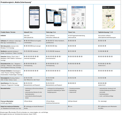 Wichtig bei der Hardware sind die Robustheit, die Abmessungen, das Gewicht, die Betriebs-/Ladezeit des Akkus und nicht zuletzt die Einfachheit der Bedienung. Zu den weiteren Unterscheidungsmerkmalen gehört auch das Softwarekonzept: Handelt es sich um eine auf speziellen mobilen Endgeräten lauffähige Kaufsoftware oder um eine webbasierte Mietsoftware für Smartphones oder Tablets? Während sich die einmaligen Investitionskosten pro Mitarbeiter zwischen etwa 100 und 1500 Euro bewegen, beläuft sich die Miete auf etwa 5 bis 15 Euro/Monat (jeweils ohne Hardware). Teilweise kostet die Auswertungssoftware extra und manchmal werden zusätzlich auch monatliche Wartungsgebühren erhoben. Da die Lizenzmodelle der einzelnen Anbieter sehr unterschiedlich sind, lassen sich die Kosten nicht ohne Weiteres vergleichen. Viele Anbieter haben daher hier keine Angaben gemacht. Deshalb sollte man nach einer Vorauswahl bei den in Frage kommenden Anbietern individuell nach den Gesamtkosten pro Mitarbeiter fragen.