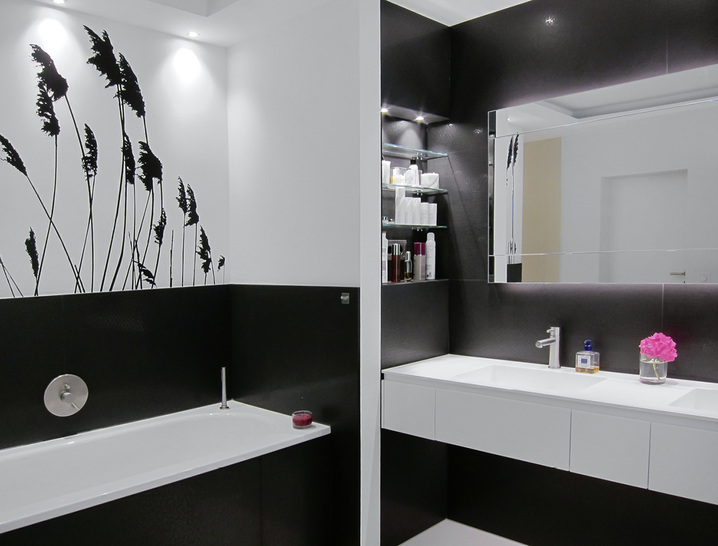 Das Bad ist geprägt vom starken Kontrast zwischen cremefarbenen Boden- und schwarzen Wandfliesen. Die weißen Sanitärobjekte heben sich klar vom dunklen Hintergrund ab. Nur im Duschbereich wurden auch die Wände mit cremefarbenen Fliesen belegt. Schwarze Fliesen waren der Kundin hier zu erdrückend, auch wenn solche „Dusch-Höhlen“ zurzeit aktuell sind.