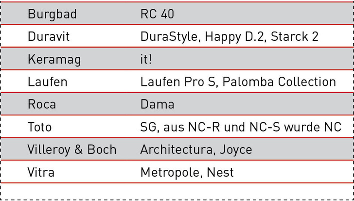 Diese und vier weitere neu zur ISH präsentierten Badkeramikserien haben wir bereits in der SBZ 5/2013 ausführlich vorgestellt. Zudem beinhaltet die Markterhebung in der SBZ 5 alle im deutschen Markt über den dreistufigen Vertriebsweg zu ordernden Serien. Die Preis- und Farbübersicht ermöglicht außerdem die Einstufung der Kollektionen auf einen Blick.