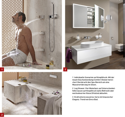 Mit der neuen Duschanwendung Comfort Shower bereichert Dornbracht den Spa-Bereich um eine Wassererfahrung im Sitzen: Verschiedene Auslassstellen und Strahlarten fügen sich auf Knopfdruck zu wohltuenden Szenarien, während die sitzende Körperhaltung eine besonders tiefgehende Entspannung erzielen soll. Comfort Shower ist optional erweiterbar um Leg Shower – eine Anwendung, die belebende Beingüsse ebenfalls auf Knopfdruck ermöglicht. Die entspannte, sitzende Körperhaltung soll Hydroanwendungen, wie Kneipp-Güsse oder auch Peelings, angenehm gestalten.
