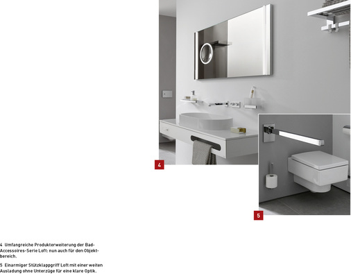Eine umfangreiche Produkterweiterung seiner Bad-Accessoires-Serie Loft hat der Lingener Hersteller für den Objektbereich vorgenommen. Zu den Neuheiten gehören daher spezifische Artikel wie eine Kosmetiktuchbox oder Badetuchablage sowie ein vielseitiges Sortiment von Griffsystemen für mehr Sicherheit. Für den Privat- wie auch Objektbereich erfuhr die Serie eine Produktergänzung um insgesamt elf Artikel. Hierzu gehören eine Handtuchablage mit Badetuchhalter, zwei einarmige, starre Handtuchhalter in verschiedenen Längen sowie ein Doppel-Badetuchhalter in zwei Ausführungen. Zusätzliche Funktionalität bieten kleine aufsteckbare Haken für Badetuchablagen und -halter. Darüber hinaus umfasst das Programm senkrechte Reservepapierhalter für eine bzw. zwei Rollen. Eine Kosmetiktuchbox sowie zwei neue, als Wand- und als Eckvariante ausgeführte Duschkörbe mit herausnehmbaren Kunststoffeinsätzen komplettieren das Portfolio. Die Neuheiten im Bereich Sicherheit bieten Komfort und Funktionalität für die barrierefreie Badeinrichtung. Dabei sollen die Griffsysteme neben ihrem Design insbesondere durch ihre ergonomische Qualität überzeugen. Hier soll die gerundete Rückseite der Rechteckrohre das sichere Zugreifen ermöglichen. Das Angebotsspektrum umfasst drei in der Länge unterschiedliche Haltegriffe, zwei Winkelgriffe in links- bzw. rechtsseitiger Ausführung sowie zwei nach oben klappbare Stützklappgriffe mit 60 sowie 85 cm Länge. Aufgrund einer neu entwickelten, besonders stabilen Wandkonsole benötigen beide Stützklappgriffe keine Unterzüge. Damit bietet das Unternehmen erstmals einen einarmigen Stützklappgriff mit einer weiten Ausladung an, der sich durch ein reduziertes Design auszeichnet. Darüber hinaus umfasst das erweiterte Sortiment ein Relingsystem, in das je nach Wunsch Mundspülglas, Flüssigseifenspender oder die Seifenschale eingesetzt werden können. Das System gibt es in zwei Breiten für die Aufnahme von zwei bzw. drei Einzelkomponenten. Damit bietet es eine gestalterische Alternative zu den klassischen Wandelementen.