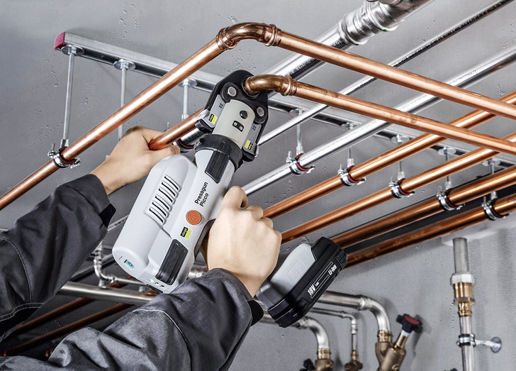Einpressanschluss für Stahlrohre: Mit einem neuen Anschlussstück macht Viega jetzt auch das Einpressen von Anschlüssen in eine bestehende Stahlrohr-Installation möglich. Für das nachträgliche Setzen eines Megapress-Einpressanschlusses benötigt der Fachhandwerker lediglich eine Bohrmaschine, ein Viega-Presswerkzeug und das neue Werkzeugset. Das passgenaue Loch bohrt der Installateur mithilfe der zu dem Set gehörenden Haltevorrichtung und der Bohrwelle. Anschließend wird der Einpressanschluss mit Pressmaschine und dem ebenfalls zum Werkzeugset gehörenden Einsatz in das Rohr eingepresst. Für die dauerhafte Dichtheit sorgt ein integriertes Profildichtelement. Zusätzlich bietet der neue Einpressanschluss wie alle Megapress-Verbinder mit der SC-Contur die Sicherheit der Zwangsundichtheit im unverpressten Zustand: Versehentlich nicht verpresste Verbindungen sind bei der Dichtheitsprüfung erkennbar undicht. Nach der Verpressung sind die Rohrverbindungen dauerhaft dicht. Der neue Einpressanschluss ist mit einem ¾“-Innengewinde ausgestattet, ein Reduzierstück für ½“-Anschlüsse ist zusätzlich verfügbar. Durch die kompakte Bauweise des Megapress-Einpressanschlusses ist es möglich, mehrere Abgänge neben- oder übereinanderzusetzen. So lässt sich auch ein individuelles Multi-T-Stück mit ¾“- und/oder ½“-Anschlüssen herstellen. Der Megapress-Einpressanschluss ist aus Stahl mit Zink-Nickelbeschichtung gefertigt und für sieben Stahlrohr-Dimensionen zwischen 1 ½“ und 6“ erhältlich.