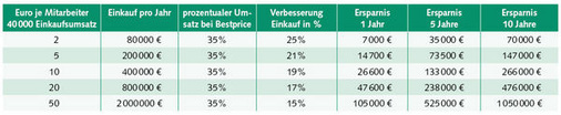 Die Rechnung geht für Christian Hoppe auf: Bereits ein kleiner Handwerksbetrieb mit fünf Mitarbeitern, der im Jahr 400000 Euro Materialeinkauf hat, kann enorm sparen. Kauft er ein Drittel seiner Waren bei BestPrice-SHK, verbessert sich sein Einkauf um ca. 20 %. Macht über 14000 Euro pro Jahr. Auf fünf Jahre gesehen beträgt die Ersparnis somit mehr als 70000 Euro. Hinzu kommt eine nach Umsatz gestaffelte Rückvergütung. Diese Rückvergütung orientiert sich an festen Umsatzgrenzen. Je mehr Christian Hoppe im Laufe eines Jahres bei BestPrice ordert, desto günstiger werden die Preise im Nachhinein. Erreicht er zum Beispiel 5000 Euro, so bekommt er von BestPrice einen Scheck über den Rabattbetrag. Er verpflichtet sich jedoch nicht dazu, bestimmte Umsatzgrenzen oder Mindestabnahmemengen zu erreichen.