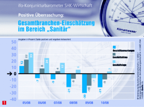 Das monatliche Ifo-Konjunkturbarometer für die SHK-Wirtschaft brachte im Oktober 2008 in der Sanitärsparte eine positive Überraschung. Statt der unter dem Eindruck der weltweiten „Erdbeben“ an den Finanzmärkten fast zu erwartenden Talfahrt erholte sich das Geschäftsklima sogar. Industrie, Großhandel und Handwerk schätzten die künftige Entwicklung etwas weniger skeptisch als im Vormonat ein und bewerteten die gegenwärtige Lage besser als im September. Hoffentlich mehr als nur ein Strohfeuer.