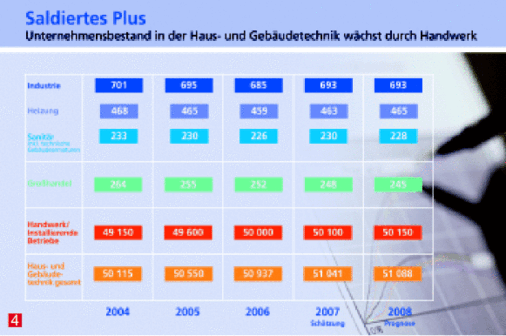 Die seit Jahren im Sektor „Handwerk/Installierende Betriebe“ moderat steigende Unternehmenszahl ist offenbar von Dauer. Da die Werte für Industrie und Großhandel weitgehend unverändert bleiben, führt das in der Gesamtbranche wohl auch 2008 zu einer leichten Erhöhung.