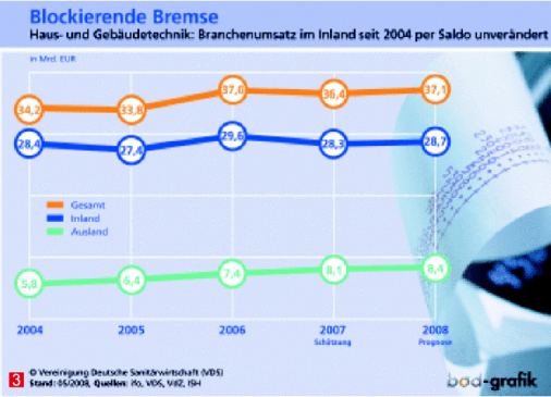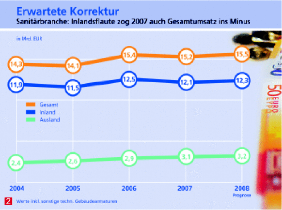 2007 erzielte die Sanitärbranche einen Gesamtumsatz von 15,2 Milliarden Euro und damit 1,3 % weniger als im Vorjahr. Zu „verdanken“ war dies der Inlandsschwäche (–3,2 %), während das Auslandsgeschäft abermals zulegte. Ob die im Frühjahr abgegebene Prognose eines moderaten Umsatzwachstums im Jahre 2008 zutrifft, wird man bereits in einigen Wochen wissen.