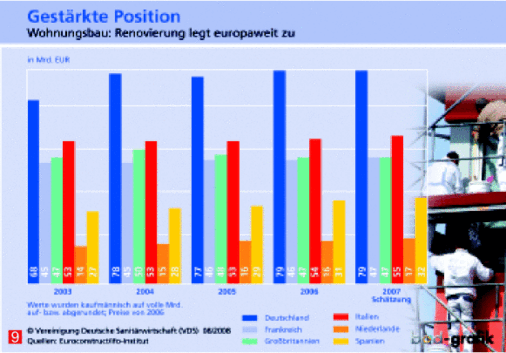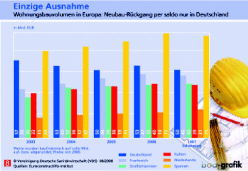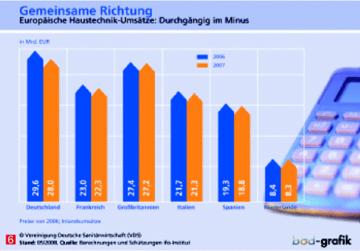 Gemessen an den jeweiligen Inlandsumsätzen blieb Deutschland auch 2007 der größte Haustechnikmarkt in Europa, dicht gefolgt von Großbritannien. Dahinter rangierten Frankreich und Italien. In einem Punkt machte die Marktentwicklung jedoch keine Unterschiede: Im Vergleich zu 2006 rutschte sie überall ins Minus.