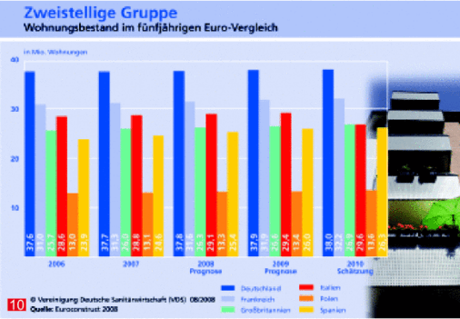 Beim Wohnungsbestand führt Deutschland die „Champions League“ (klar) an. Mit geschätzten 38 Millionen Wohnungen liegt es 2010 vor Frankreich, das es auf gut 32 Millionen bringen soll. Am Ende der „zweistelligen Gruppe“: Polen mit knapp 14 Millionen Wohnungen.